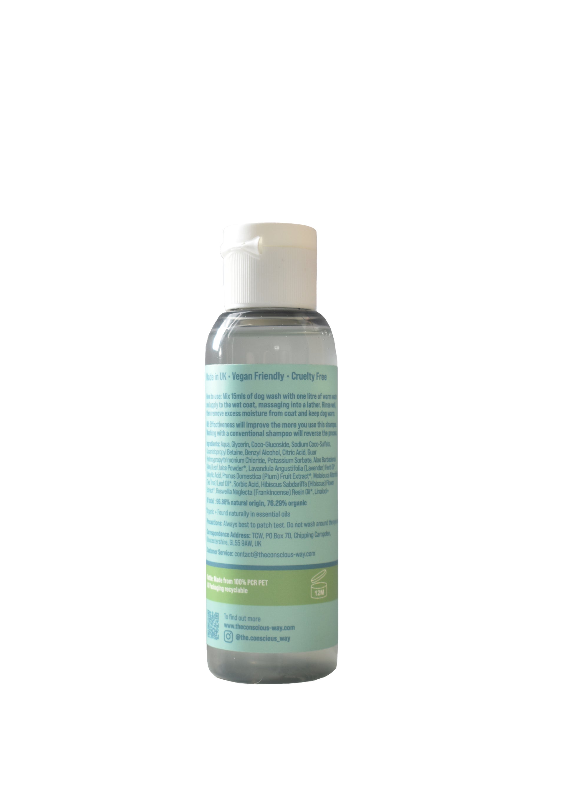 1. Fill an empty, clean one litre bottle with warm water and add 15mls of The Conscious Pet Kind & Gentle Dog Wash, invert to mix. Wet your dog all over with warm (never hot) water, using either a sponge or a gentle shower. Squeeze the diluted product along the dog’s back starting at the base of the neck, working the shampoo through the coat. Gradually work along each side and underneath, down the legs etc until the shampoo has reached all areas. Now for the lovely bit – massage the dog wash into your dog’s coat taking care to avoid getting product or water in his/her eyes or ears. Use your fingers gently but firmly to work the lather through the coat and gently massage, taking your time so that both you and your best friend can enjoy the soothing and healing effect of the aloe vera and chamomile essential oils.